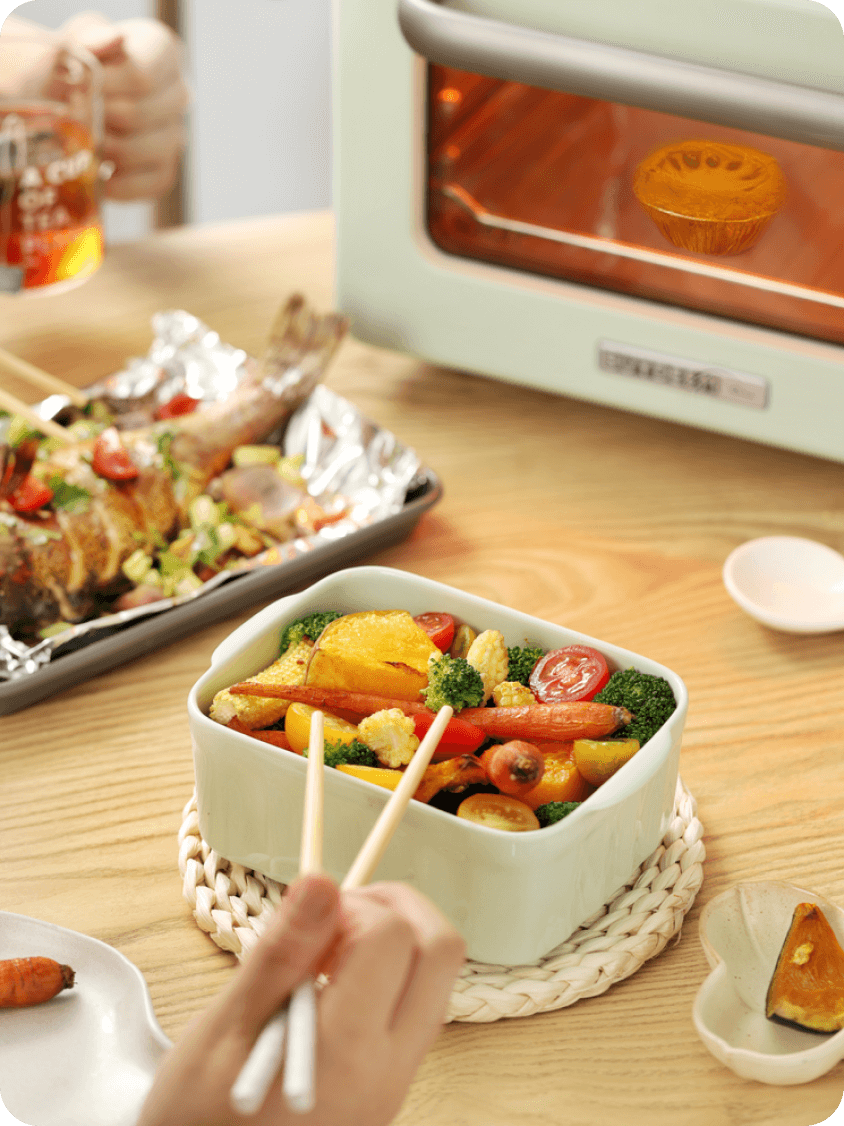 利用快速加热的烧烤功能,大小火候自动掌控。制作脆皮烤肉和焗奶酪,表皮香脆,水分不流失,0油烟复刻街头烧烤。
