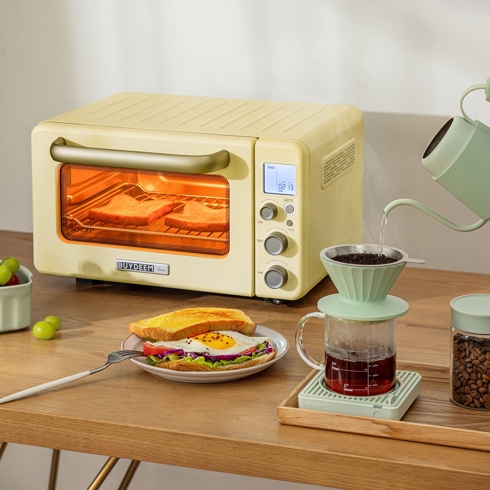 用我们的多功能烤箱丰富您的早晨!无论是烤面包、羊角面包,还是享用火腿奶酪早餐吐司,都能轻松应对。灵活的计时设置让您享受酥脆美味的吐司,轻松开启美好一天。