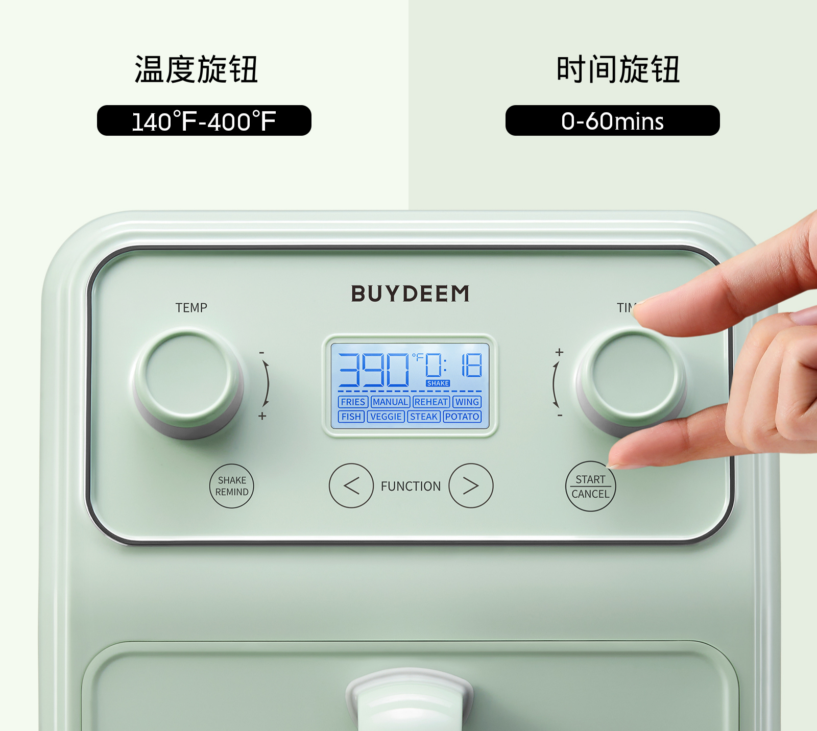 双旋钮设计,无需频繁点击,告别触碰失灵。温度和时间可在设定范围内灵活调整。